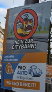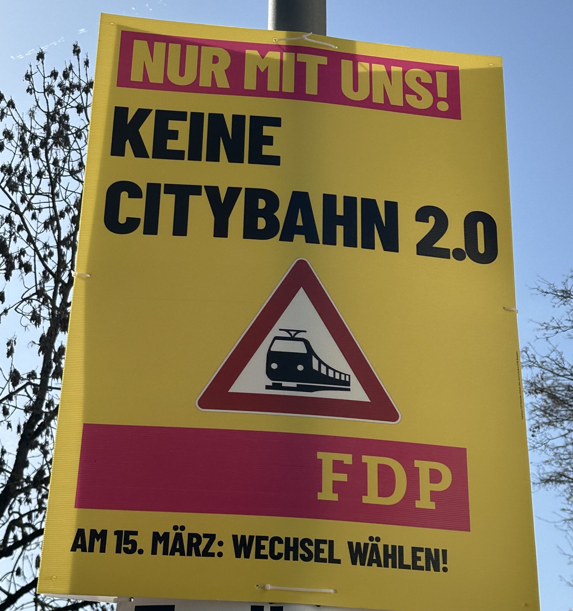Sachliche Klarstellung: Das Wort „Citybahn“ beschreibt ein konkretes Projekt, welches abgewählt wurde von den Bürgern im Jahr 2020 (also vor mehr als 5 Jahren). Das heisst aber weder, dass das Verkehrsmittel Straßenbahn (manchmal auch Tram, Stadtbahn o.ä. genannt) an sich zur Wahl stand noch, dass diese Entscheidung auf ewig gelten muss/soll.