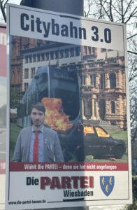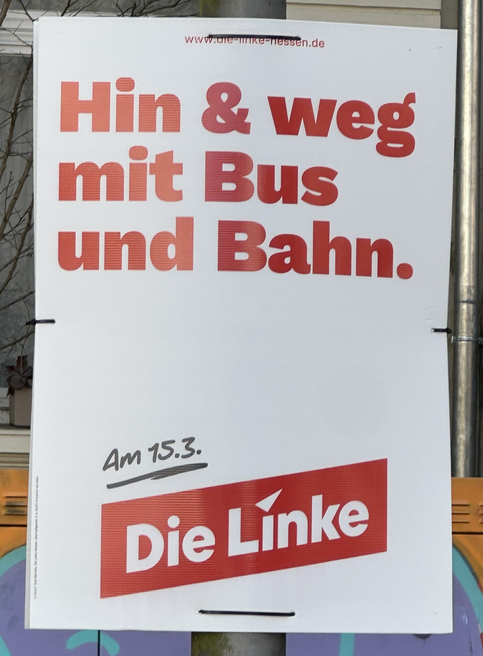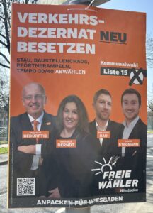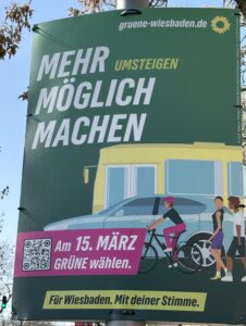 Wir haben den öffentlichen Raum in Wiesbaden vor der Kommunalwahl erkundet und dabei viele Plakate gefunden die sich mit dem Thema Verkehr/Mobilität beschäftigen.