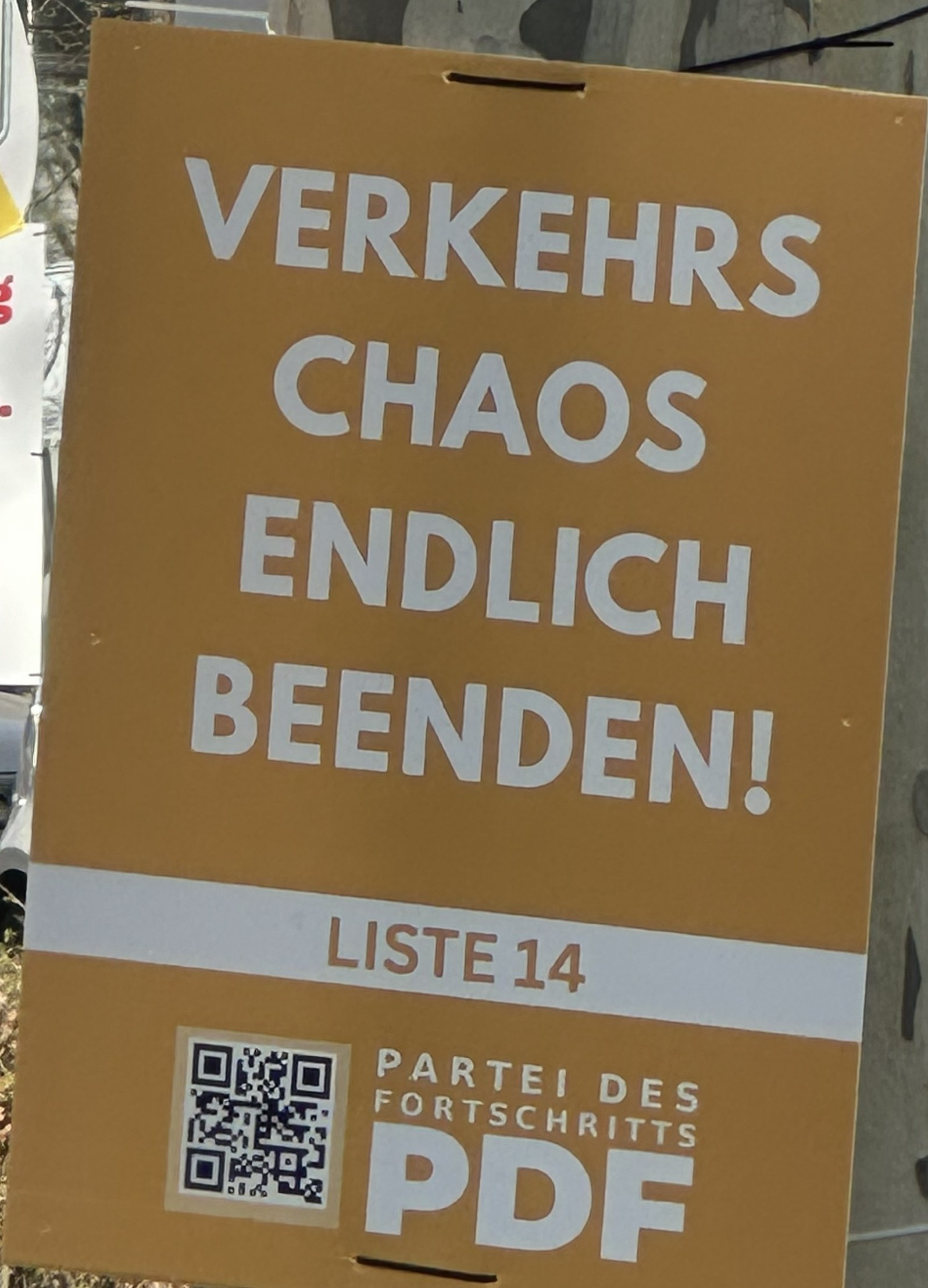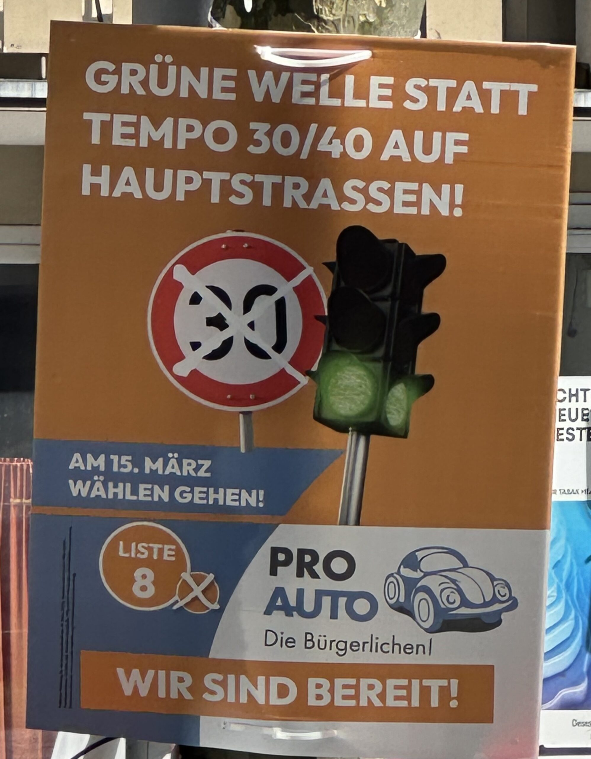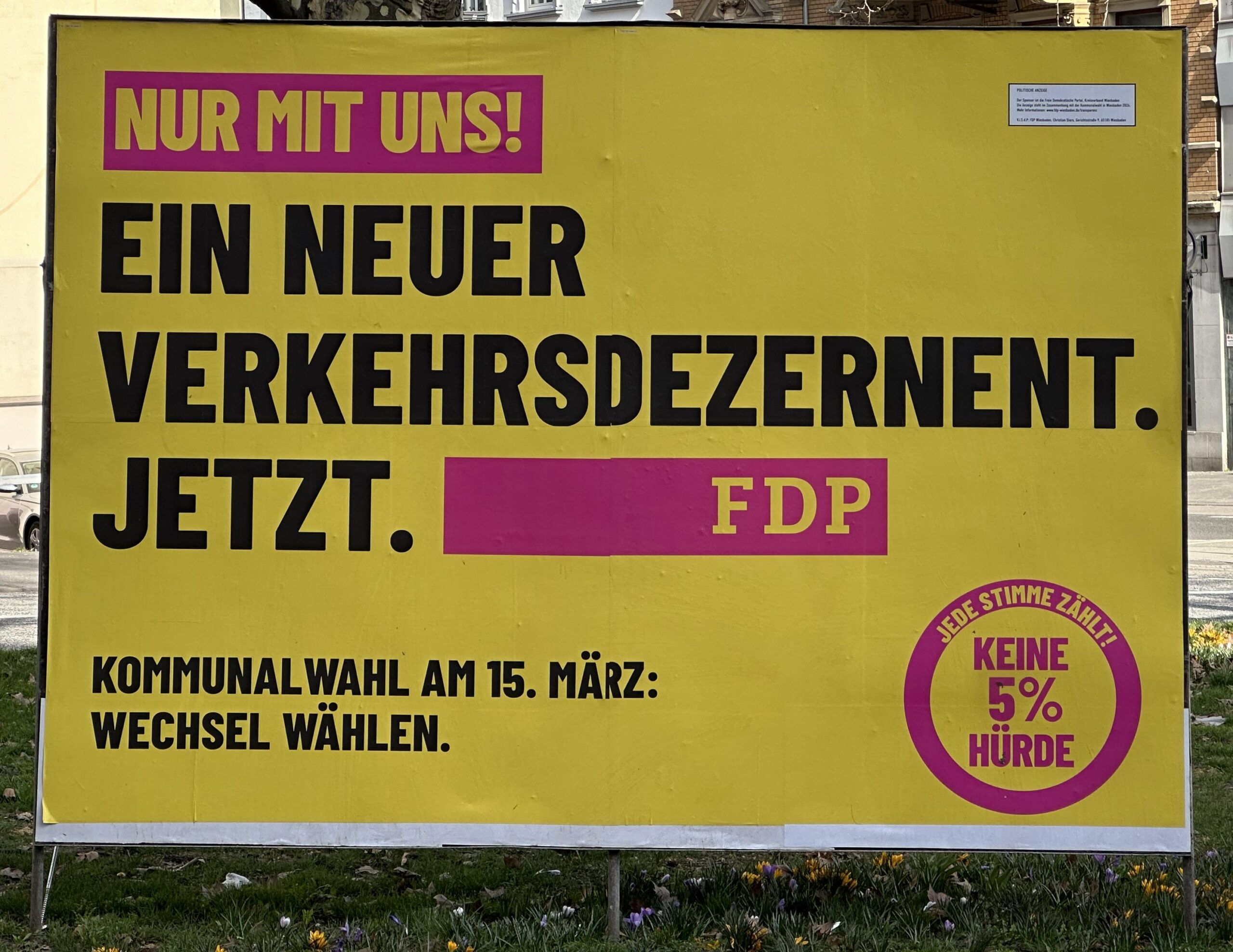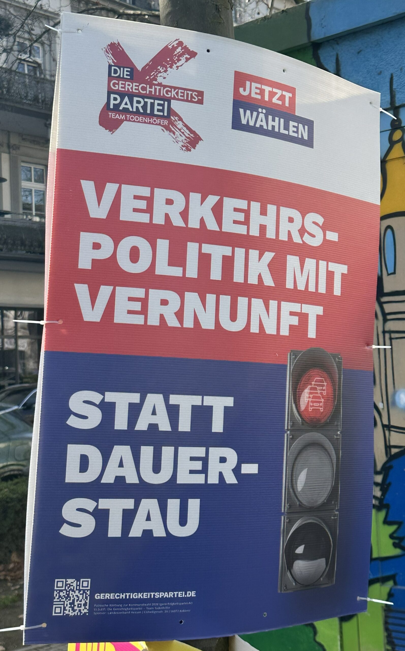 Viele Parteien gehen mit dem Thema „Stau“ in den Kommunalwahlkampf. Dass das oftmals durch unvermeidbare Baustellen oder einfach die große Menge an Autos verursacht wird, wird nicht erwähnt. Auch die Lösungsvorschläge sind unklar (sowohl auf den Plakaten wie in den Wahlprogrammen). Umweltspuren zurückbauen? Das würde aber den Busverkehr unattraktiv machen durch Verspätungen, und könnte zudem zu Dieselfahrverboten und Gegen-Klagen führen. Fahrradverkehr baulich trennen, also in Seitenstraßen umlegen? Dann müsste man dort aber gute, echte Radinfrastruktur (wie Radstraßen etc.) bauen. Aber gegen Wegfall von Parkplätzen hierfür ist man dann ebenso…
