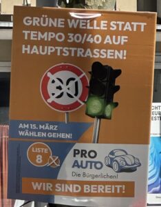 Auch das Thema der Tempolimits im Stadtzentrum ist natürlich Thema im Wahlkampf. Dass dieses „30/40“ Wechselspiel ein Kompromiss ist, und dass Tempolimits auch dem Lärmschutz und der Sicherheit dienen, wird dabei geflissentlich ignoriert.