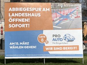 Neben den hier gezeigten Plakaten, fordern auch andere Parteien eine erneute Öffnung des Rechtsabbiegers am Landeshaus. Hierbei wird vergessen, dass er aufgrund vieler von Pkws verursachter Unfälle mit Bussen und Fahrrädern geschlossen werden musste zur Gefahrenabwehr.