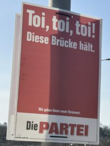 Auch dass Wiesbaden was Infrastruktur angeht von Glück/Pech (Wasserrohrbruch, Salzbachtalbrücke) und äußeren Umständen bzw. Akteuren (Autobahn GmbH, Deutsche Bahn) abhängig ist, wird anhand der Wiesbadener Brücken satirisch thematisiert.